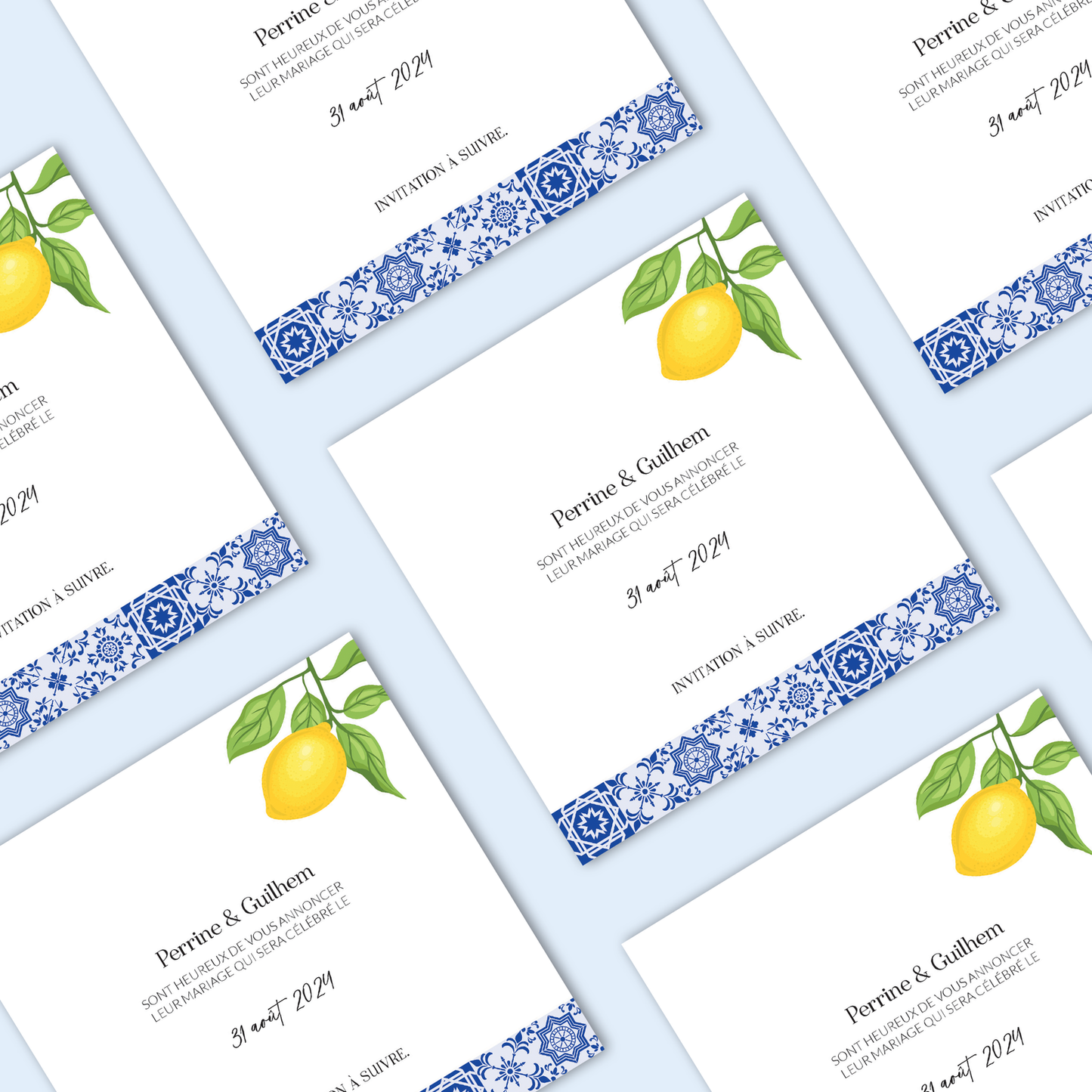 Un souffle méditerranéen pour célébrer l’amour avec fraîcheur et élégance. Inspirée par les villages ensoleillés et les paysages italiens, cette collection associe le bleu éclatant des cieux à la pureté du blanc, sublimés par des motifs de carreaux de ciment et des illustrations de citrons. Une invitation à partager une journée lumineuse, empreinte de douceur et de joie de vivre.