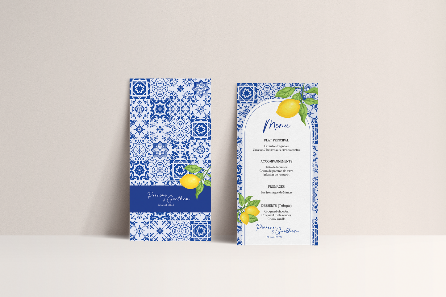 Un souffle méditerranéen pour célébrer l’amour avec fraîcheur et élégance. Inspirée par les villages ensoleillés et les paysages italiens, cette collection associe le bleu éclatant des cieux à la pureté du blanc, sublimés par des motifs de carreaux de ciment et des illustrations de citrons.