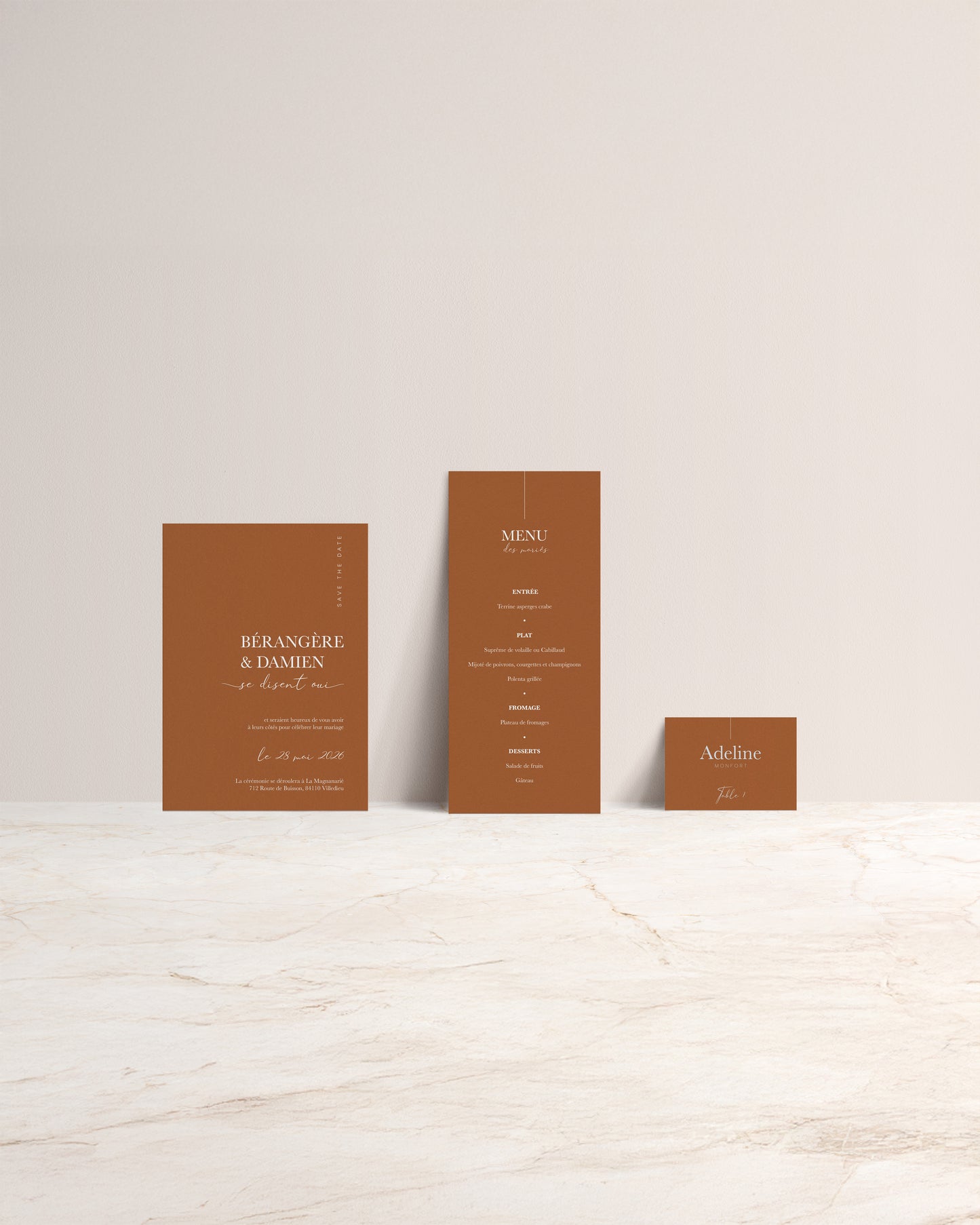Ce menu au format élancé et raffiné reprend les codes de la collection Bohème, avec sa teinte terracota chaleureuse et sa mise en page épurée.